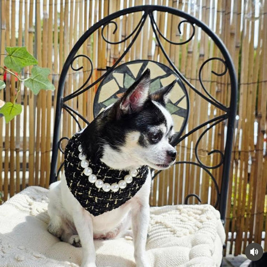 Chanel-Inspired Pearl Pet Bib – Black Classic Tweed for Stylish Pets