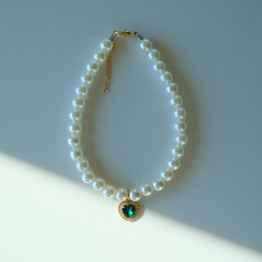 Royal Pearl Pet Necklace – Emerald Heart Charm | Luxury Look for Pets