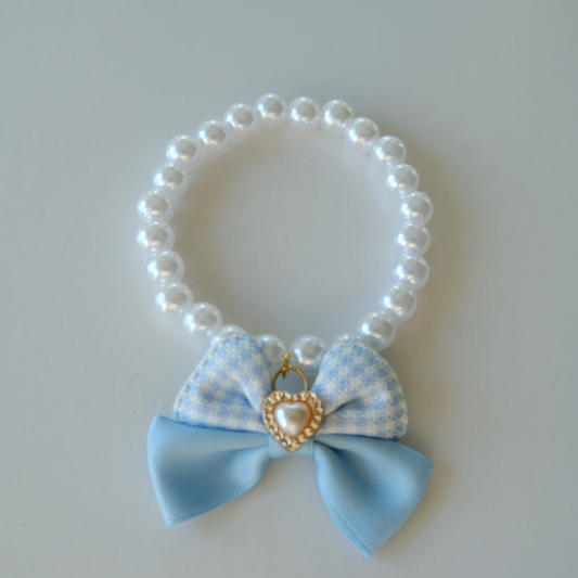 Princess Pearl Pet Necklace – Blue Bow with Heart Pearl Pendant | Cute Pet Accessory