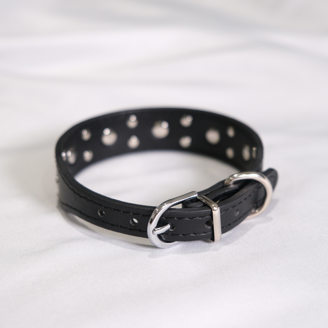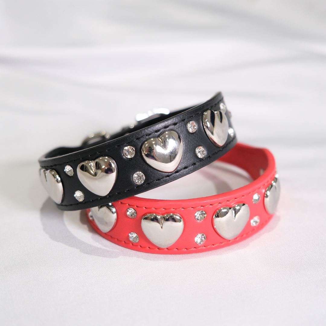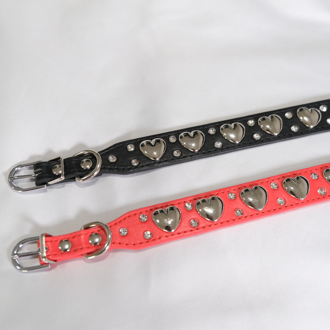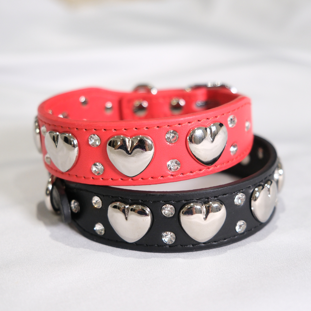 This bold black dog collar features stunning silver heart studs paired with sparkling crystal accents for a stylish and edgy look. Crafted from high-quality PU leather, it’s durable, comfortable, and perfect for pets with personality.