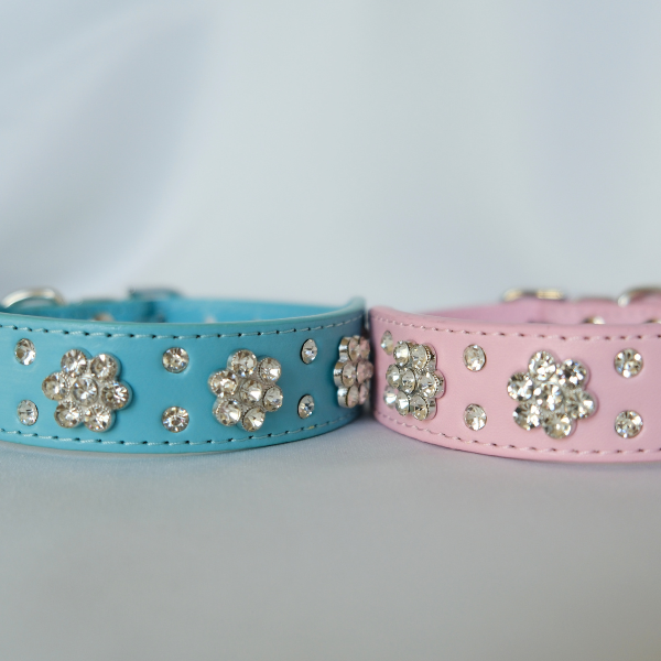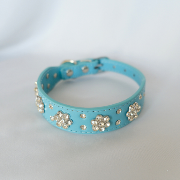 Let your pup shine in style with this Blue Crystal Flower Dog Collar, crafted from smooth faux leather and adorned with dazzling rhinestone flower charms. The cool blue tone gives it a stylish pop while the crystal accents add serious sparkle.