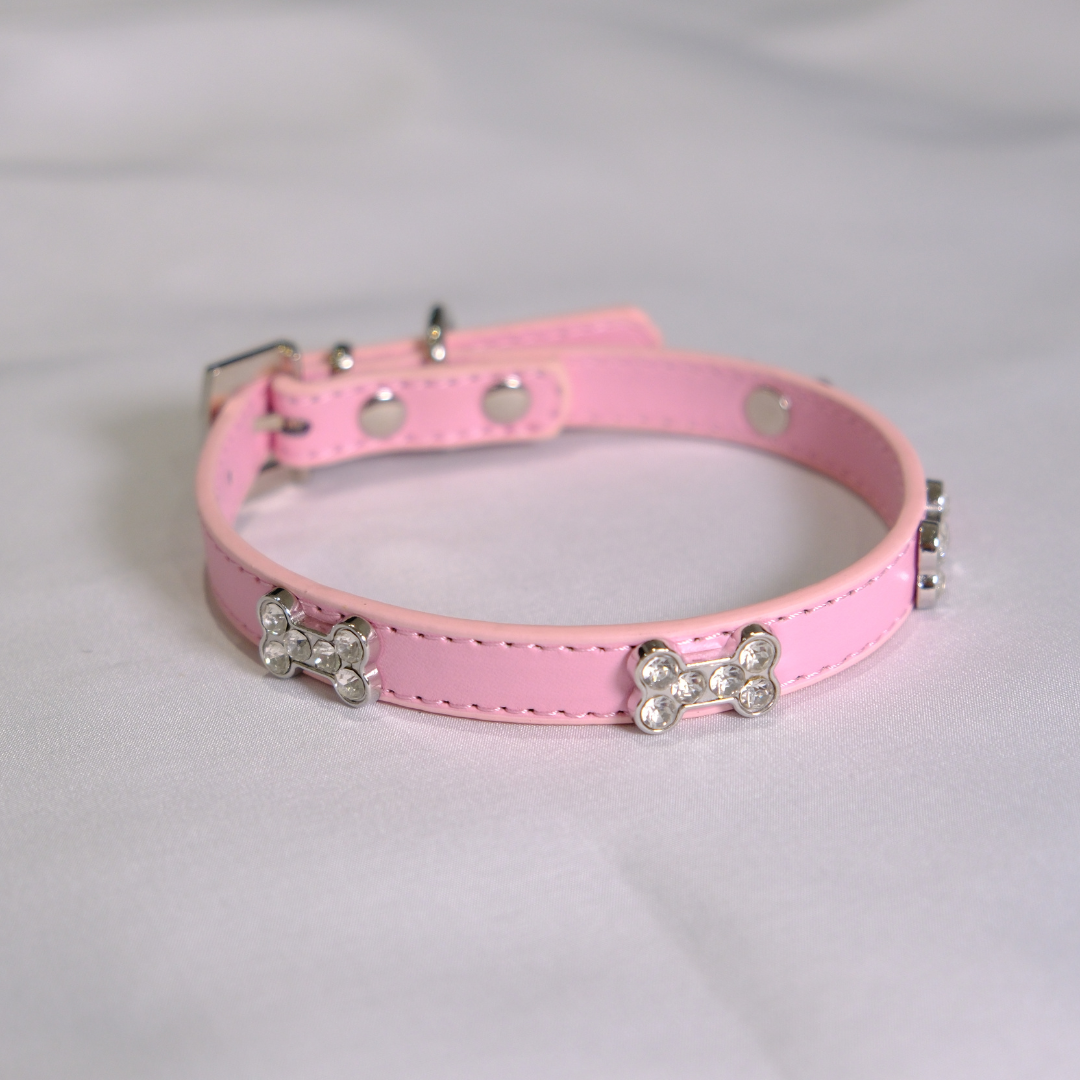 Add a touch of elegance to your pet’s look with this soft pink collar featuring crystal-studded bone charms. Whether it’s a stroll through the park or a day at the market, this collar is sure to get compliments.