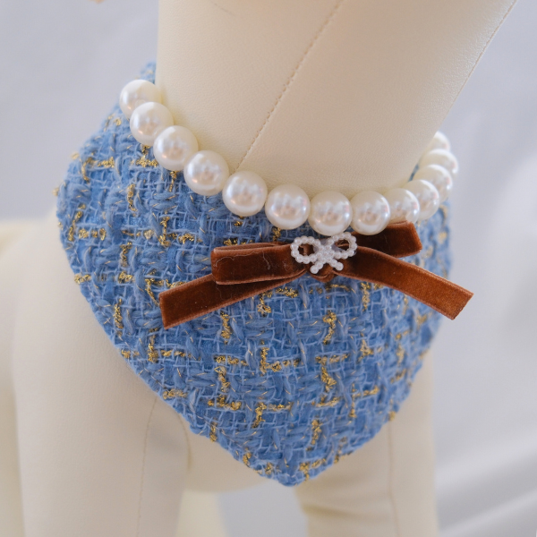 This Chanel-style blue pet bib features a luxurious textured weave, statement pearls, and a velvet bow for a vintage-meets-modern look. Perfect for pampered pets who deserve to shine.