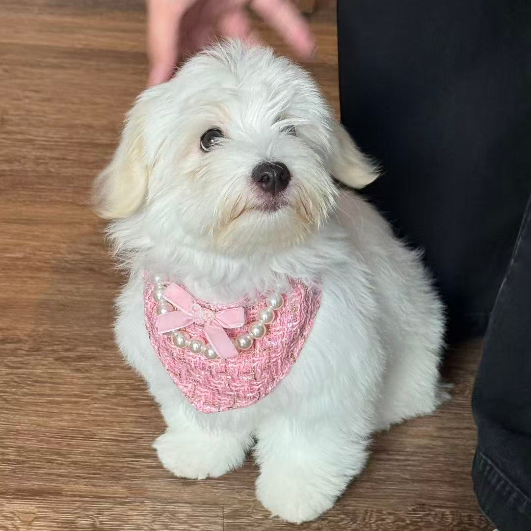 Made with soft boucle-style fabric and adorned with large pearls and a delicate bow, this accessory brings a refined charm reminiscent of classic French couture. Lightweight and comfortable, it’s perfect for birthdays, photo shoots, or a stylish walk in the park. Suitable for small dogs or cats such as Pomeranians, Bichons, or Ragdolls.