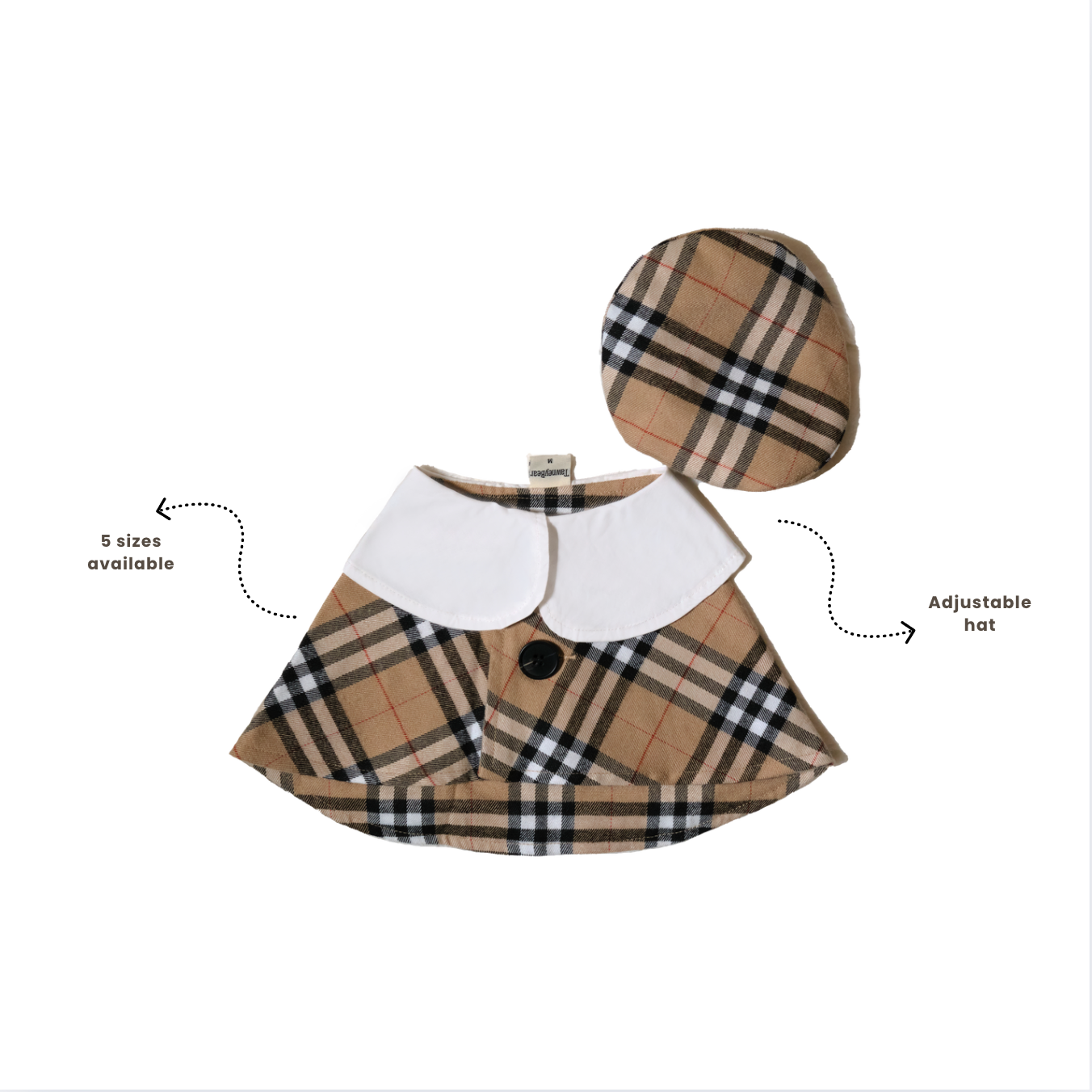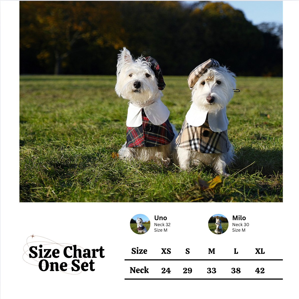 Introducing the Classic Barkberry Elegance Set, a quintessential wardrobe essential that exudes sophistication and timeless style. This set features a refined tartan pattern skirt complemented by a sharp white collar and a chic, adjustable hat, perfect for both casual strolls and special occasions.