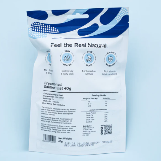 Waita Freeze-Dried Salmon Fillet is made from 100% whole salmon fillet, freeze-dried to preserve the essential nutrients and natural oils your pet needs. Rich in Omega-3 fatty acids, DHA, and EPA, this functional treat promotes healthy skin, a shiny coat, joint mobility, and cognitive health.