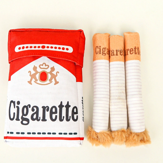 Add a dose of humor to your pup’s playtime with this hilarious cigarette-themed squeaky toy. Featuring three plush “cigarettes” and a crinkle pack design, this toy makes crinkle sounds and squeaks when chewed, keeping your dog engaged and entertained. Made from pet-safe, durable fabric that’s soft on teeth and ideal for small to medium-sized dogs. Perfect as a quirky gift or a conversation-starting toy.