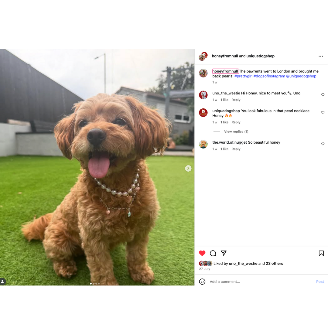 Introducing the Pearly Paws Necklace, an original handcrafted accessory made for dogs who were born to sparkle.