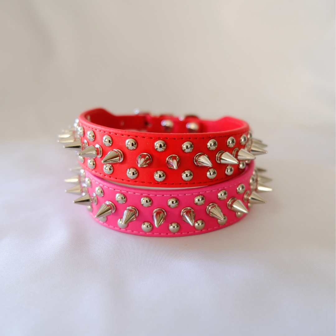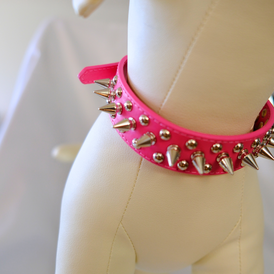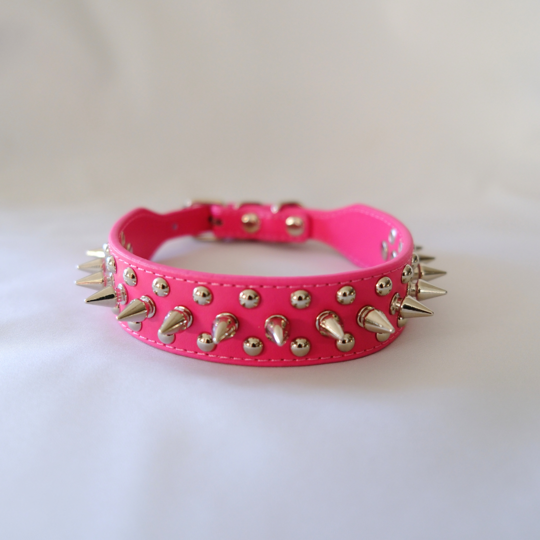Add a pop of color with this hot pink dog collar! Decorated with silver spikes and round studs, it’s perfect for stylish pets. Durable, adjustable, and designed for comfort and flair.