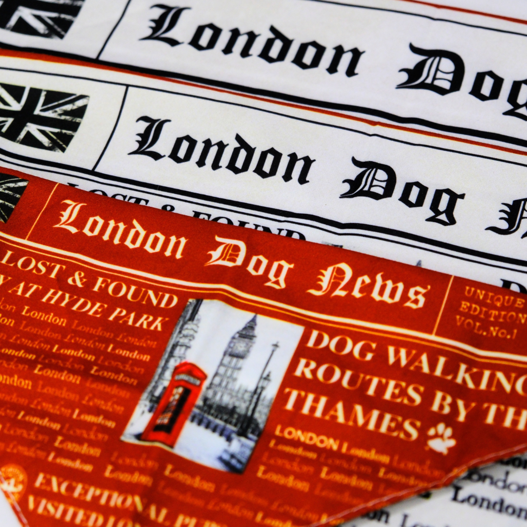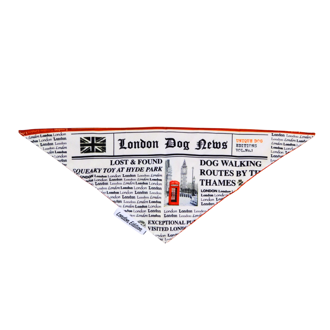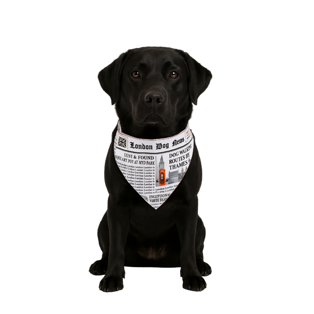 The London Dog News Bandana is our playful tribute to classic British newspapers – complete with mock headlines, Big Ben, red phone booths, and a tail-wagging sense of humor.