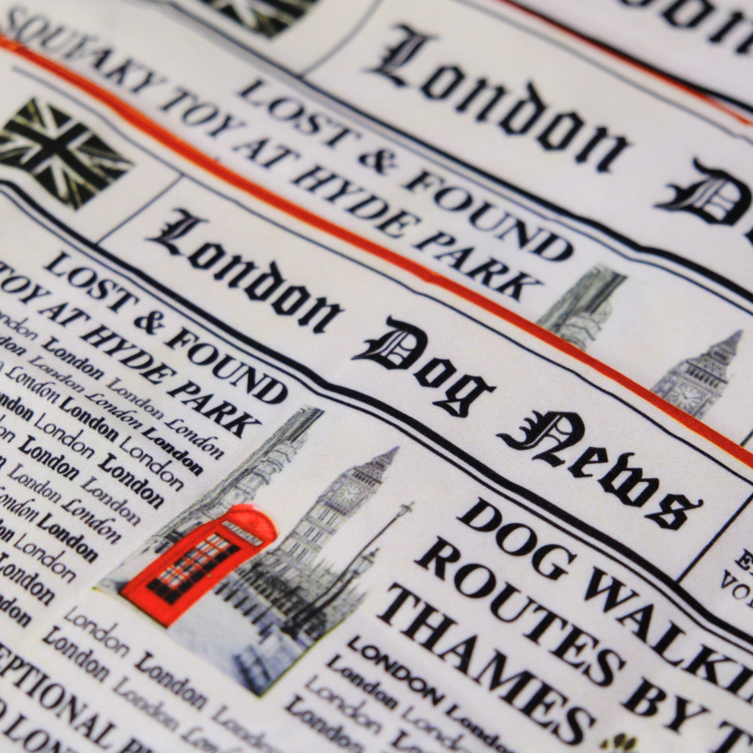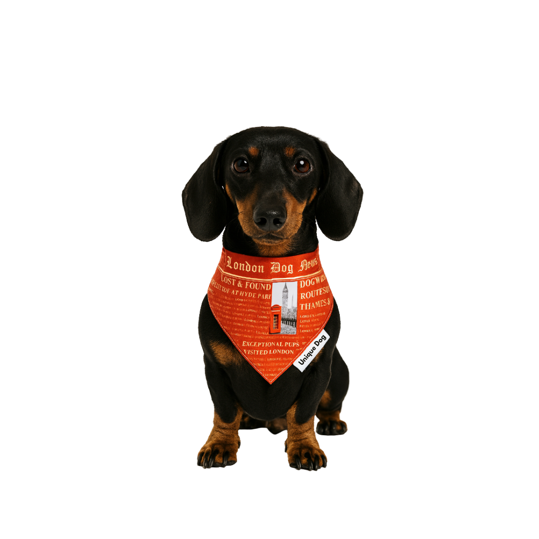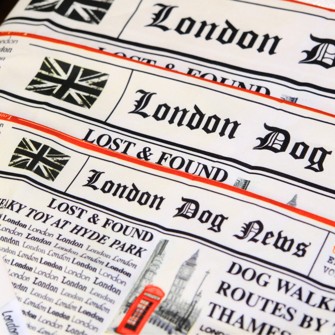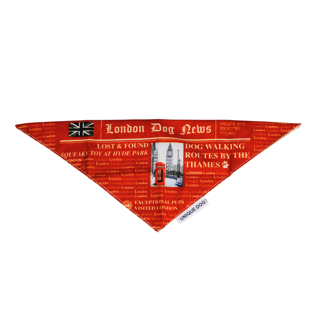 The London Dog News Bandana is our playful tribute to classic British newspapers – complete with mock headlines, Big Ben, red phone booths, and a tail-wagging sense of humor.