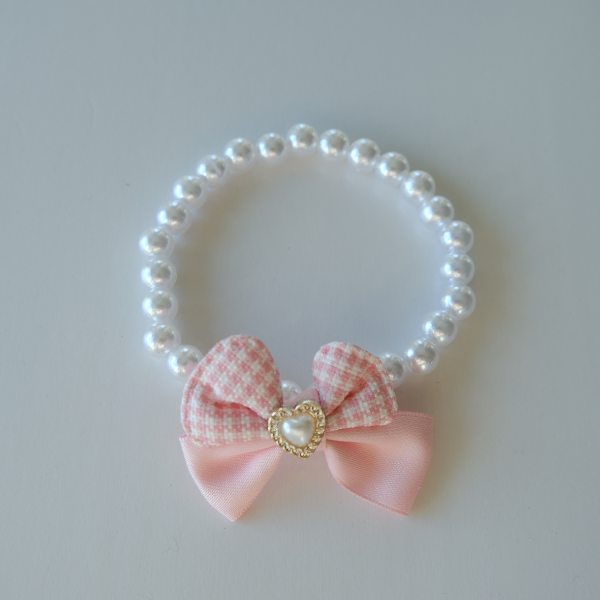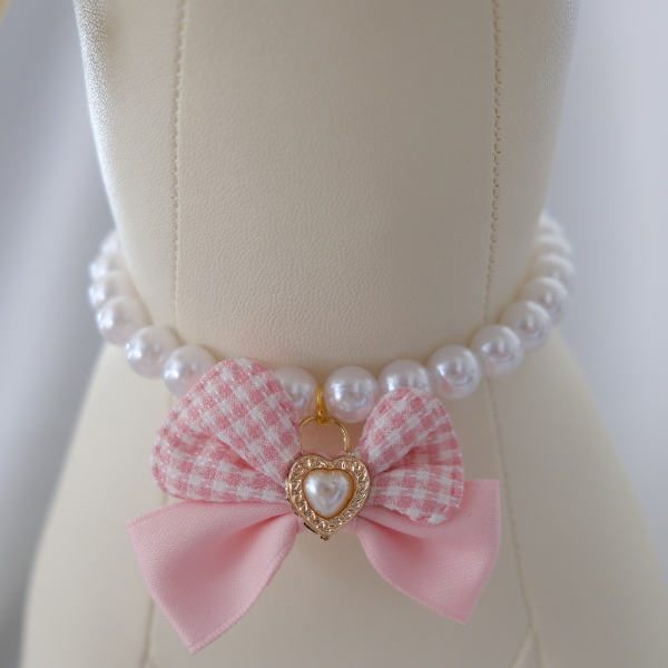Sweet as candy and cute as can be – this Pink Gingham Bow Pearl Necklace is made for little fur princesses. Featuring glossy faux pearls and a heart-shaped pearl charm framed in gold, it’s finished with a pink gingham bow layered over a satin ribbon. Perfect for birthdays, photoshoots, or just being fabulous.