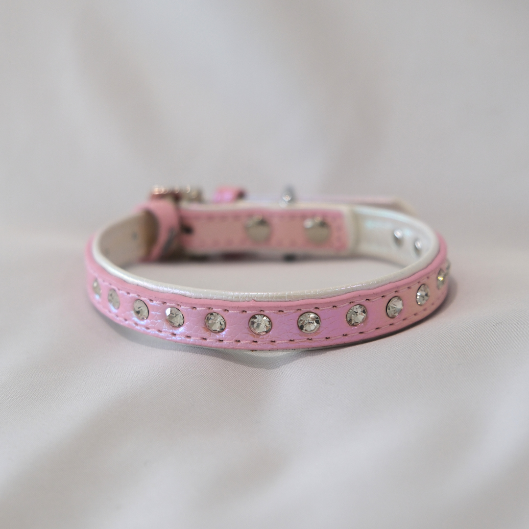 Give your pup the glam treatment with this Pink Sparkle Rhinestone Collar. Crafted from glossy faux leather in a soft pastel pink and studded with glimmering rhinestones, it’s the perfect balance of sweet and sassy. A sparkling buckle and strong D-ring complete the look, making it ideal for pets who love to shine.