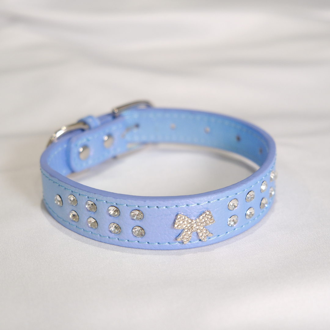 This vibrant blue collar combines shine and elegance, with glimmering rhinestones and a glitter bow centerpiece. A perfect accessory for pets that love to stand out, this piece pairs bold color with classy sparkle.